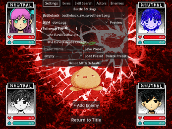 - Completely customizable battles via a visual GUI editor. Change the battle's battleback, BGM, enemies, party members, skills, items, and other aspects of battle to your liking. Or, share your created preset and have others try defeating your creation.